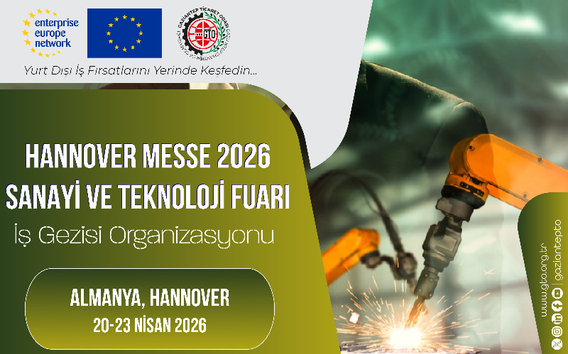 Gaziantep Ticaret Odası tarafından 20-23 Nisan 2026 tarihleri arasında, Almanya’nın Hannover kentinde gerçekleştirilecek olan Hannover Messe 2026 Sanayi ve Teknoloji Fuarı’na yönelik fuar ziyareti ve iş gezisi organizasyonu düzenlenecektir.