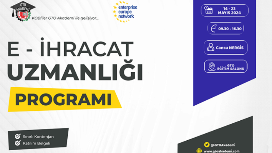 Avrupa İşletmeler Ağı projesi kapsamında E-İhracat Uzmanlığı Programı 14.05.2024-23.05.2024 tarihleri arasında gerçekleştirilmiştir.